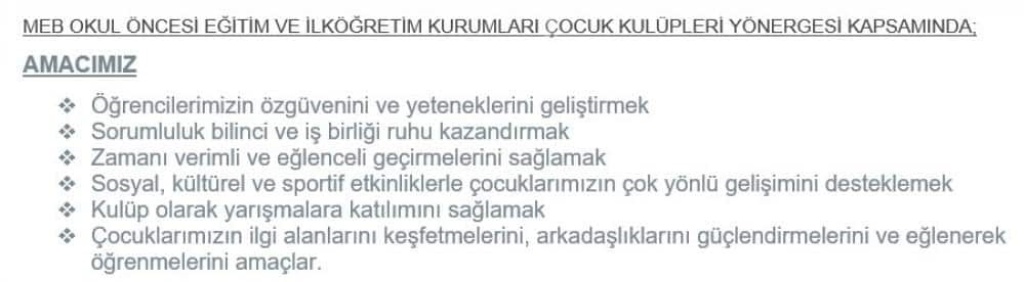 5. Çocuk kulübü kayıtları Eğitim-Öğretim yıl kayıtlan ile birlikte baslar, Eğitim-Öğretim yıl süresince devam eder.